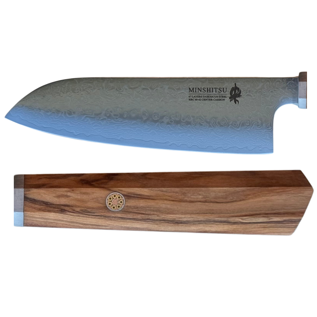 Trenger du en lett og effektiv allround-kniv? MinShitsu Premium Green Forrest Santoku kombinerer hakking, skjæring og filetering med enkelhet og presisjon. Det elegante oliventre-håndtaket gir komfort og kontroll, mens 67 lag damaskusstål med hard karbon-kjerne sikrer langvarig skarphet og slitestyrke. Santoku gjør jobben raskere, tryggere og mer behagelig.