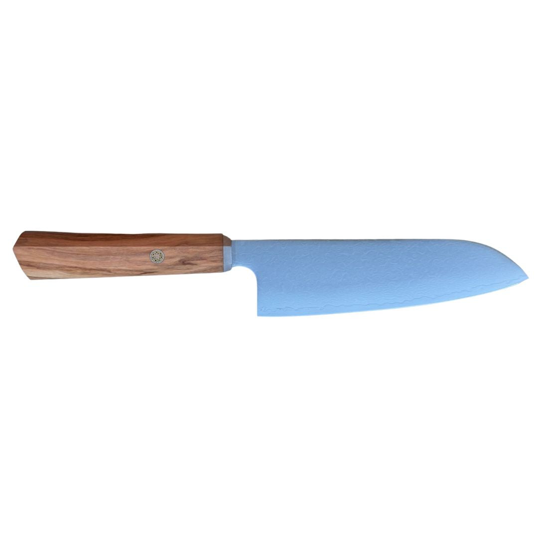 Hakking, skjæring og filetering føles enkel med denne lette Santoku. Minimalistisk oliventre-håndtak og hard karbon-kjerne gir maksimal kontroll og eleganse.