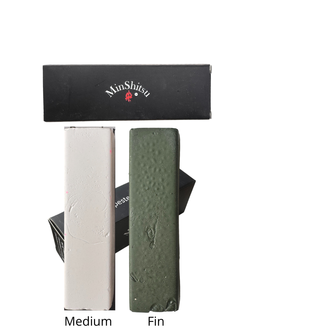 MinShitsu Slipe Pasta i grønn og hvit variant er et essensielt produkt for deg som ønsker den ultimate skarpheten på knivene dine. Denne slipemassen gir en speilblank finish og fjerner mikroskopiske ujevnheter for en presis og holdbar egg.