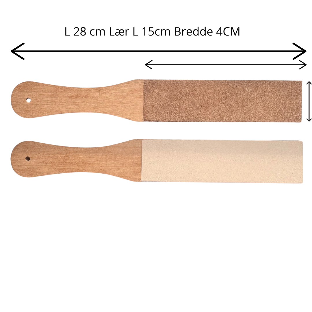 Bruk slipemassen på lærstroppen og før kniven frem og tilbake med jevnt trykk. Dette gir en skarp og balansert egg, perfekt for Damascus, karbonstål og rustfritt stålkniver.